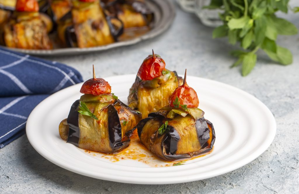 İslim Kebabını Oluşturun: Kızarttığınız patlıcanları her birine bir köfte yerleştirip sarın. Hazırladığınız bu sarılı patlıcanları fırın kabına dizin.
